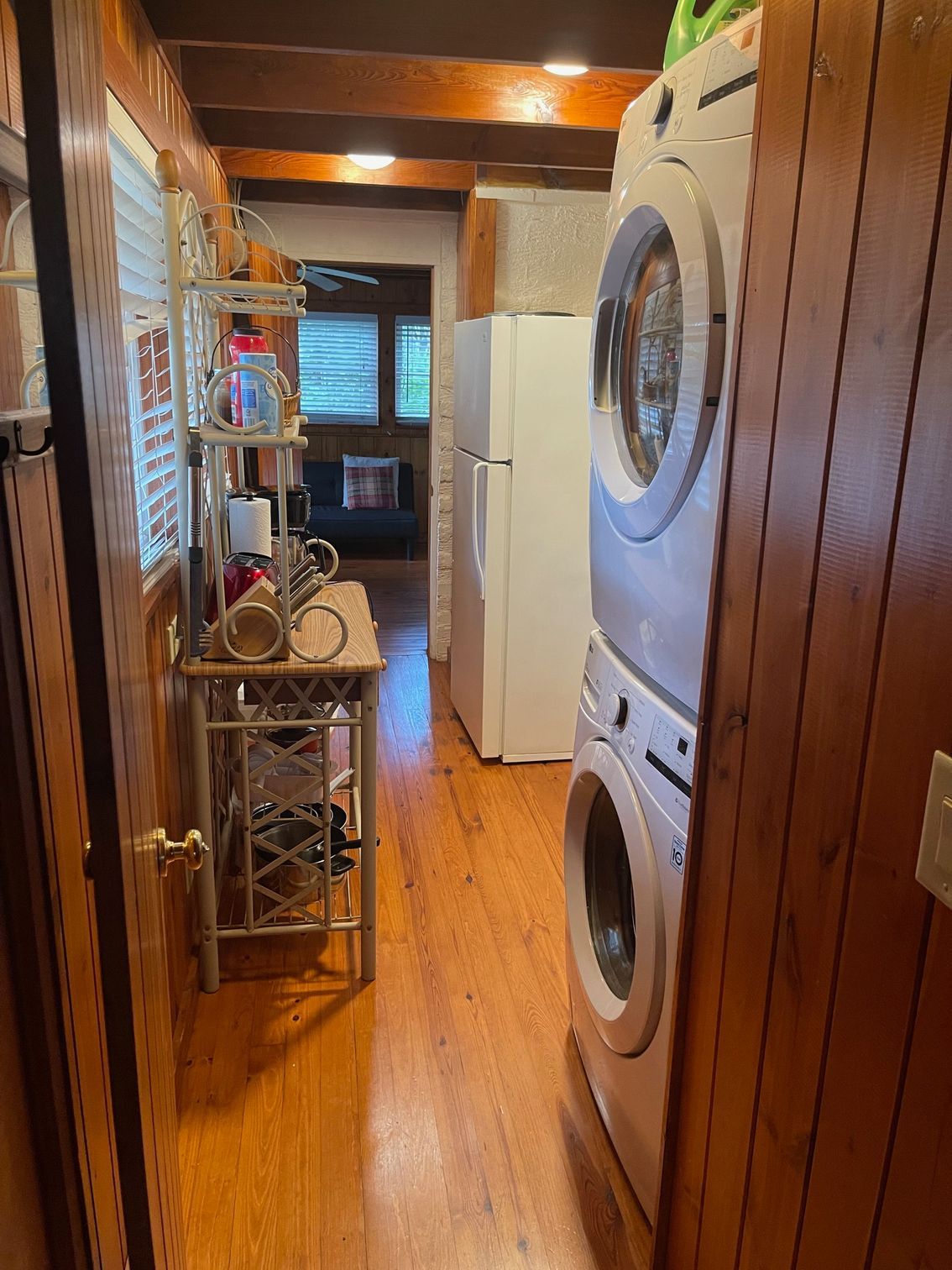 The modern kitchen is fully equipped with full size refrigerator, 24" stove, wall-hung microwave, dishes, utensils, toaster, coffee maker, and stackable washer/dryer. There is a large front deck with nice view of Pinnacle Mountain.