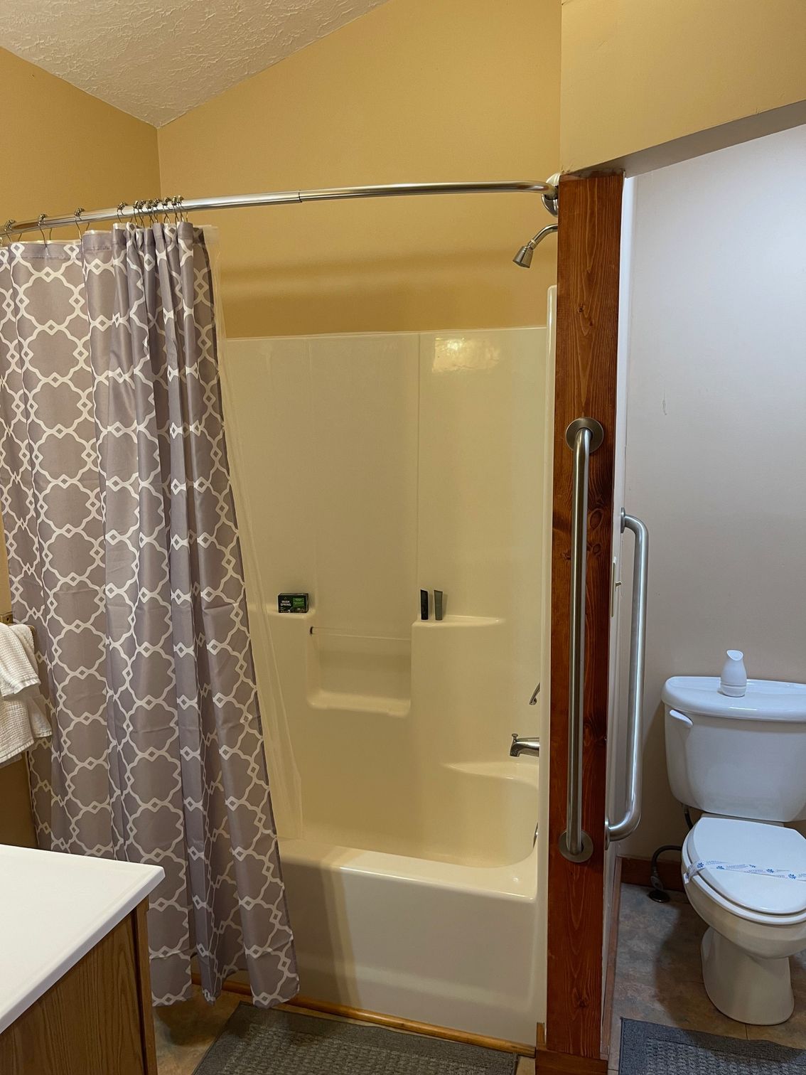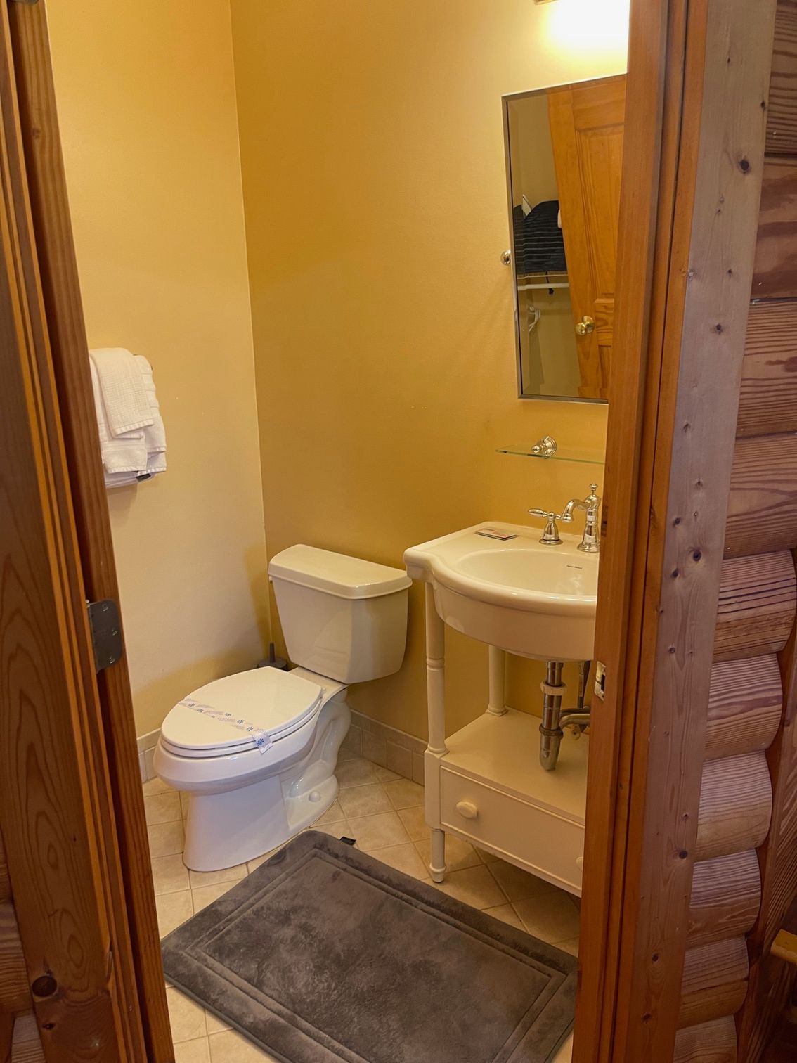The second bedroom has wood walls of tongue and groove ponderosa pine boards pickled in a beautiful shade of Georgian Brick, a lovely Victorian style wrought iron Queen bed with wall mounted flat screen cable TV, and has its own full bath with tub/shower and vanity you will just love! There is also a convenient washer / dryer.