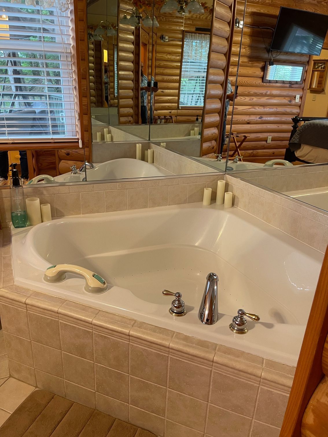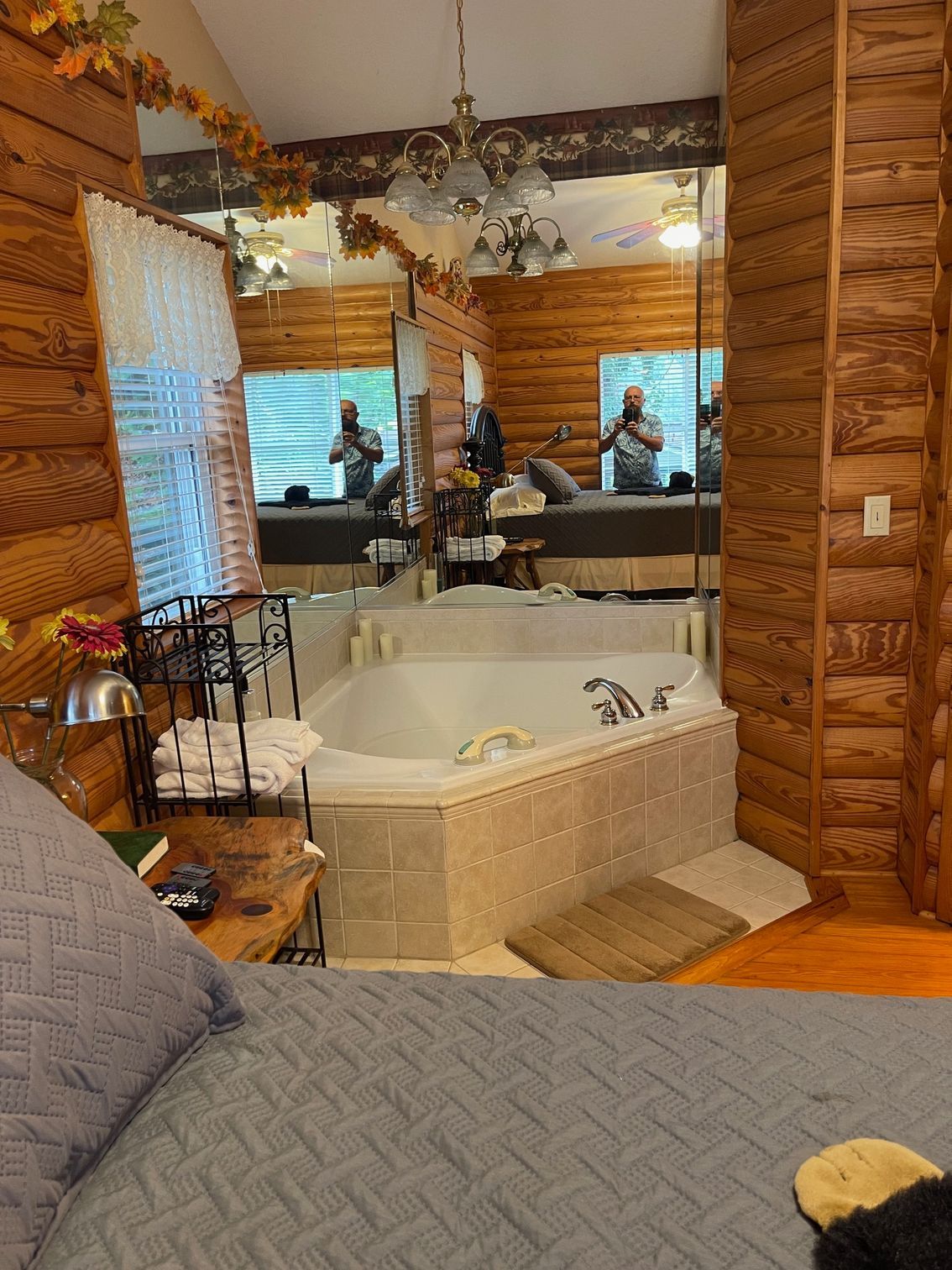 The master bedroom boasts a beautiful tall black Queen spindle bed and an enticing 2 person champagne bubbler Jacuzzi tastefully surrounded by mirrors, dimming chandelier, and wall mounted large flat screen TV - you'll never want to leave it!