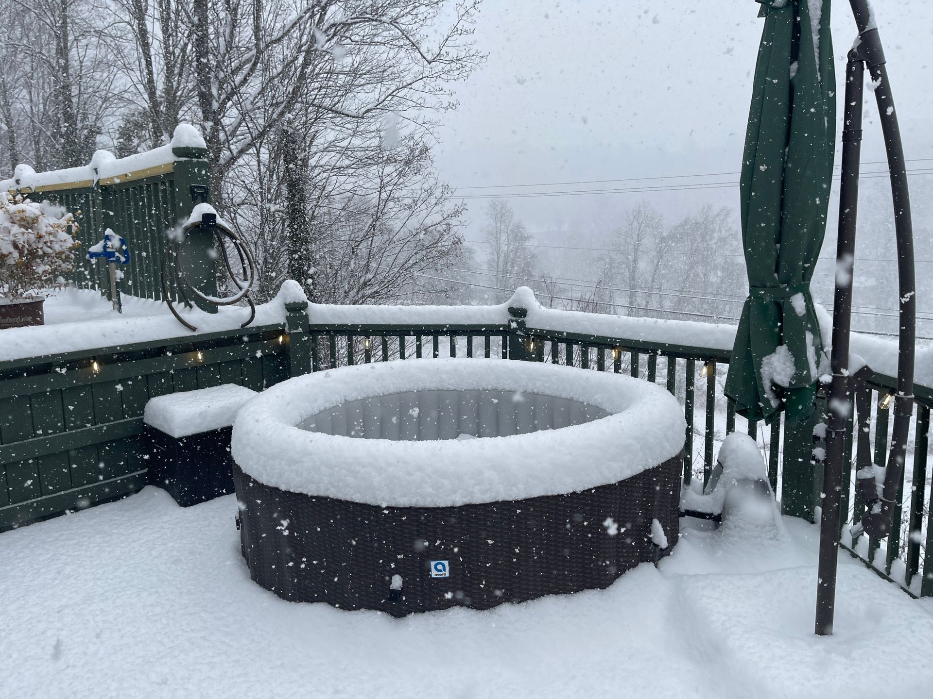 Fully furnished with one Queen bed, a Twin-size pull-out couch, two comfy velvet rocking chairs, and a large flat screen TV. It also features a fully equipped kitchenette and is air-conditioned and heated for year-round comfort. Enjoy your own private bathroom with tub/shower, as well as a washer/dryer, and a private hot tub on the deck with beautiful mountain views - all just a 10-minute walk from town! I know you are going to love staying in this unique and cozy new addition to The Mountain Aire!