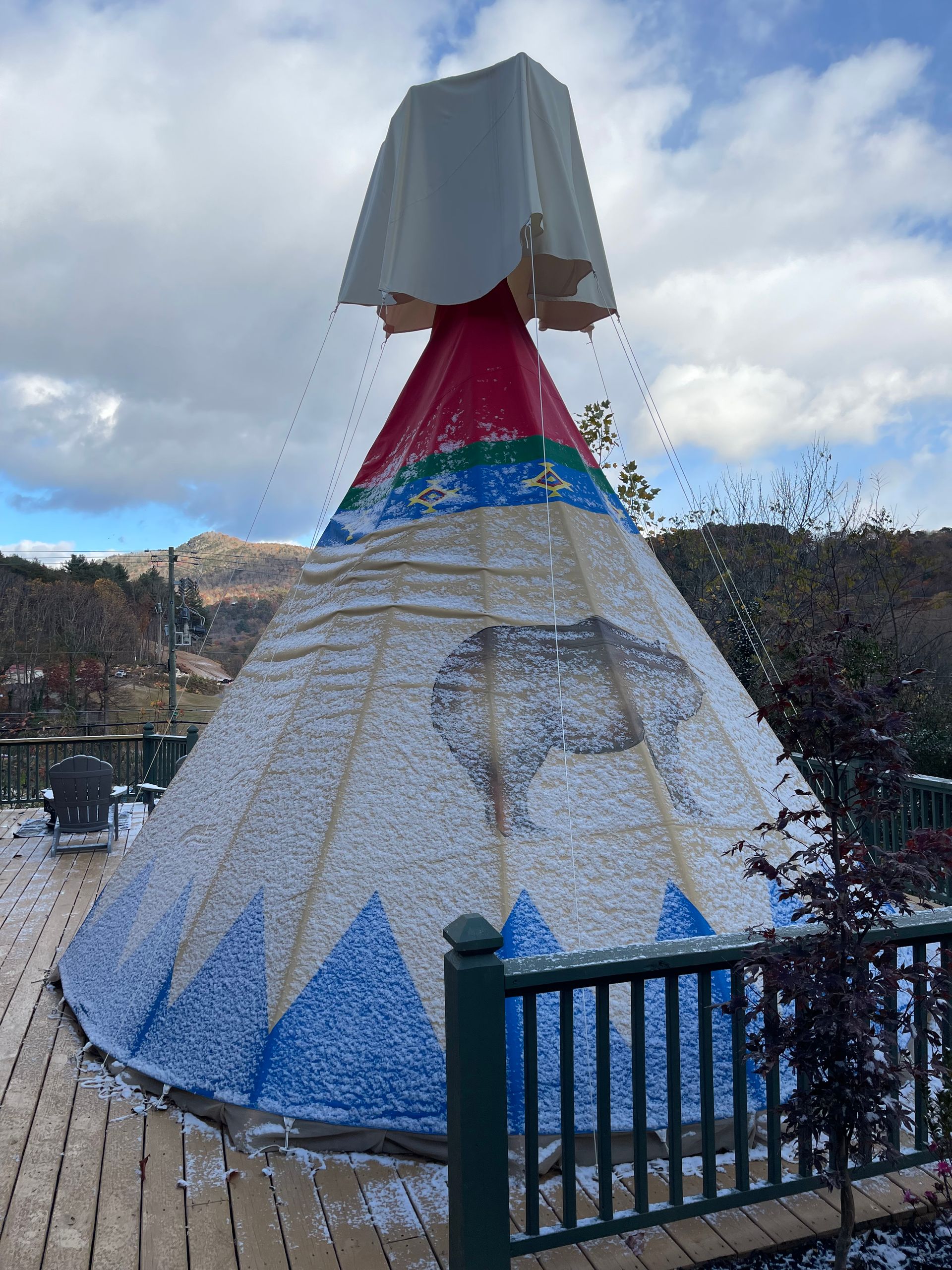 An authentic, beautiful, handcrafted & hand-painted Tipi, made in Oregon, and now here for your enjoyment in Clayton, Georgia! This fully Air Conditioned & Heated authentic Tipi features a Queen bed and two fold-out couches for kids, a flat screen TV, a small hanging rack with shelves & drawers, a private bathroom with tub/shower, and all on a large deck with a stocked Fire Pit, three person Swing, & beautiful mountain view, plus we are just a 12-minute walk to downtown Clayton! Come create a wonderful experience for you and your family in The Tallulah Tipi, our newest addition to Mountain Aire Cottages, Inn, & Glamping!!We have a 2-night minimum.